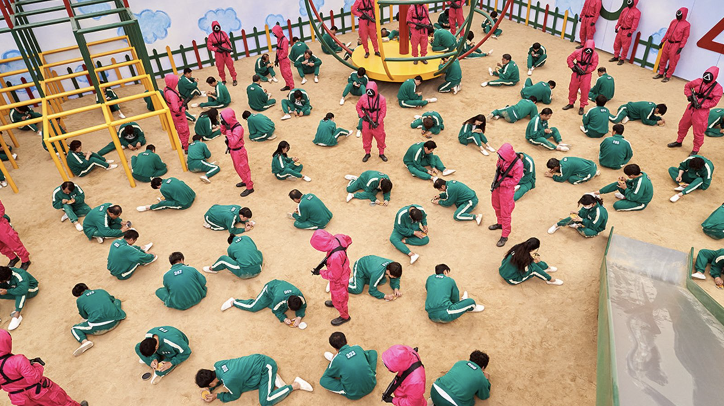 Still, it tackles some global issues like class division, gender inequality, and the dangers of unfettered capitalism and material culture. These kinds of social justice-oriented topics, increasingly common in Netflix entertainment like Money Heist (2017) and 13 Reasons Why (2017), are incredibly popular both in America and abroad. The series taps into the existing demand for survival shows in the fashion of something like Battle Royale but also takes advantage of the ongoing increase in popularity of Korean cultural products across the globe—commonly known as hallyu or the Korean Wave.